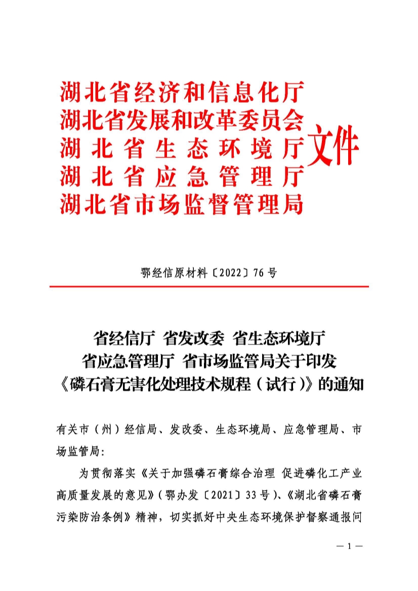 湖北省《磷石膏無(wú)害化處理技術(shù)規(guī)程(試行)》出臺(tái) 系我國(guó)首個(gè)磷石膏無(wú)害化綜合處理技術(shù)規(guī)程