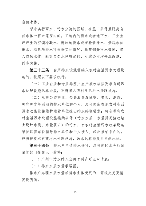 《細則》共計四章六十三條,主要是對《廣州市排水條例》相關原則、規(guī)定進行補充和完善、具體解釋,更好的指導廣州市排水的規(guī)劃、建設、管理、維護及應急等方面工作。明確市、區(qū)水務行政主管部門、鎮(zhèn)街、村居及公共排水與污水處理設施維護運營單位在廣州市排水管理工作中的職責,強調(diào)市相關部門共同推進排水管理重點工作職責。細化了排水工程在規(guī)劃、建設、維護管理方面的職責分工、技術要求和相關規(guī)定,以及大型排水設施的相關保護要求和規(guī)定。細化了各行業(yè)、排水戶的污水排放、接駁標準,及技術管理要求,明確其排水許可申請、辦理程序的材料、手續(xù)流程、方法以及有關規(guī)定。