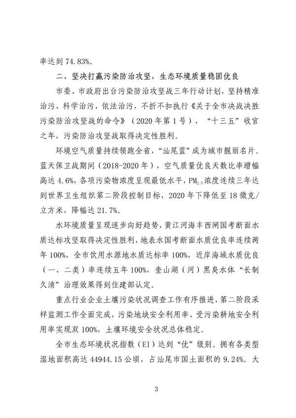 生態(tài)環(huán)境持續(xù)改善。大氣環(huán)境質(zhì)量繼續(xù)領(lǐng)跑先行,PM2.5濃度穩(wěn)定達(dá)到或優(yōu)于世界衛(wèi)生組織第二階段目標(biāo);水環(huán)境質(zhì)量持續(xù)提升,水生態(tài)功能得到恢復(fù),近岸海域水質(zhì)總體優(yōu)良。