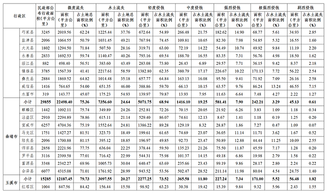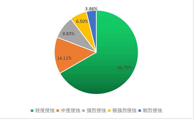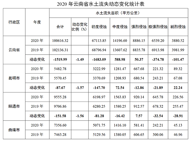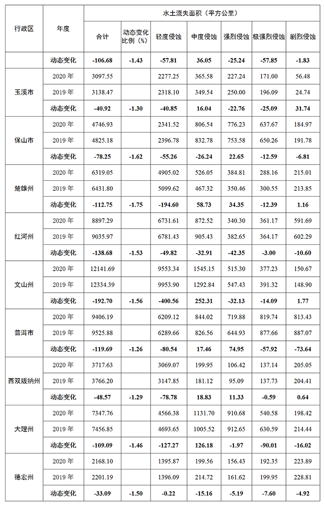 2020年,據(jù)全省水土流失動態(tài)監(jiān)測成果顯示,云南省水土流失面積10.06萬平方公里,占土地總面積39.40萬平方公里的25.54%。其中,輕度侵蝕面積為6.71萬平方公里、中度侵蝕面積為1.42萬平方公里、強烈侵蝕面積為0.89萬平方公里、極強烈侵蝕面積為0.65萬平方公里、劇烈侵蝕面積為0.39萬平方公里。