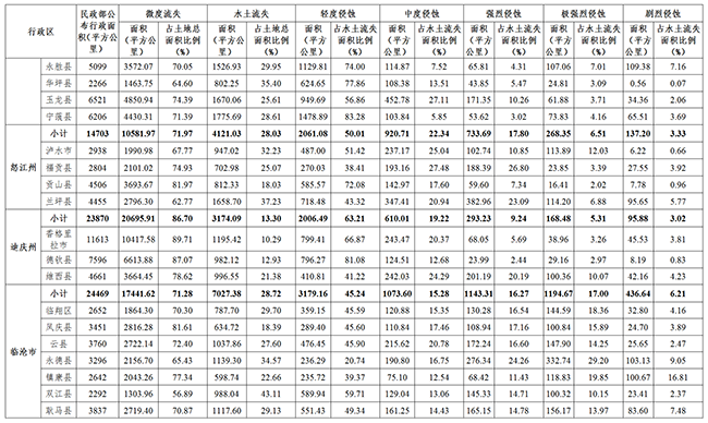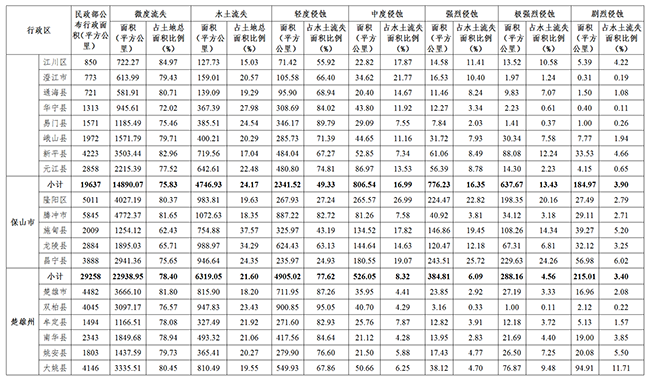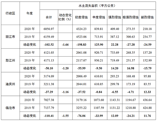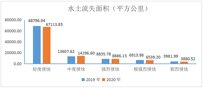 2020年全省水土流失總面積較2019年減少1519.99平方公里,其中:輕度侵蝕面積減少1683.09平方公里,中度侵蝕面積增加588.98平方公里,強烈侵蝕面積增加50.37平方公里,極強烈侵蝕面積減少374.78平方公里,劇烈侵蝕面積減少101.47平方公里。