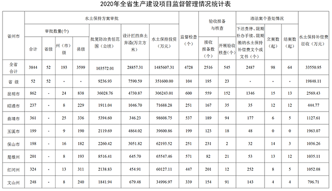 2020年,云南省共審批生產(chǎn)建設(shè)項目水土保持方案3844個,其中,省級審批52個,州(市)級審批193個,縣級審批3599個。設(shè)計水土保持資金148.56億元,防治責(zé)任范圍103572.01公頃,設(shè)計攔擋棄土棄渣28857.31萬立方米。