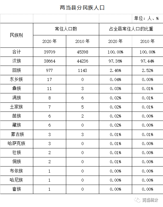 根據(jù)兩當(dāng)縣第七次全國(guó)人口普查結(jié)果,現(xiàn)將2020年11月1日零時(shí)全縣各鄉(xiāng)(鎮(zhèn))常住人口[2]、民族人口等有關(guān)數(shù)據(jù)公布如下: