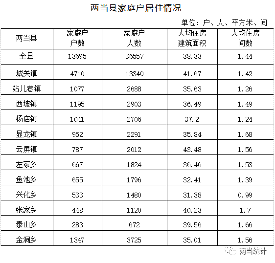 全縣家庭戶人口人均住房建筑面積38.33平方米,人均住房1.44間。