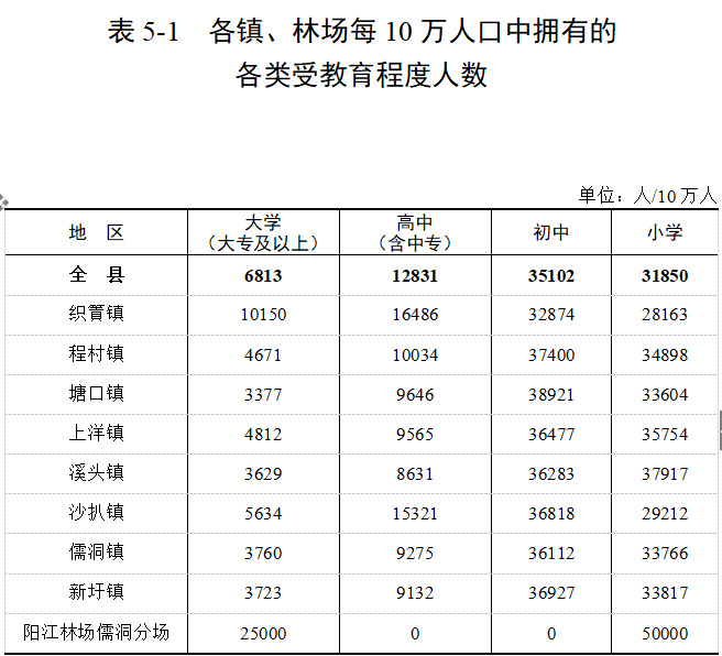 根據(jù)第七次全國人口普查結(jié)果,現(xiàn)將2020年11月1日零時我縣8個鎮(zhèn)及陽江林場儒洞分場的人口受教育基本情況公布如下: