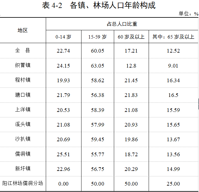 8個鎮(zhèn)及陽江林場儒洞分場65歲及以上老年人口比重超過7%,其中,6個鎮(zhèn)、陽江林場儒洞65歲及以上老年人口比重超過14%。