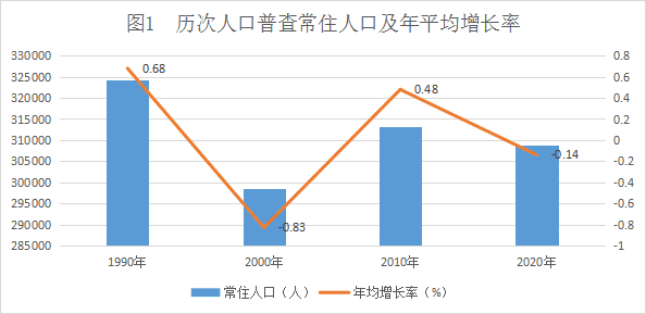 全區(qū)常住人口[3]為308785人,與2010年第六次全國人口普查的313253人相比,十年共減少4468人,下降1.43%,年平均增長率為-0.14% 。