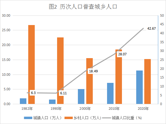 全縣常住人口中,居住在城鎮(zhèn)的人口為113719人,占42.67%;居住在鄉(xiāng)村的人口為152811人,占57.33%。與2010年第六次全國(guó)人口普查相比,城鎮(zhèn)人口增加41632人,鄉(xiāng)村人口減少31913人,城鎮(zhèn)人口比重提高14.60個(gè)百分點(diǎn)。