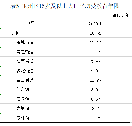 玉州區(qū)常住人口中,15歲及以上人口的平均受教育年限為10.62年。