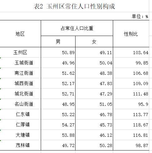 玉州區(qū)常住人口中,男性人口為462181人,占50.89%;女性人口為445940人,占49.11%。人口性別比(以女性為100,男性對女性的比例)為103.64,與2010年第六次全國人口普查的107.38相比下降3.74。