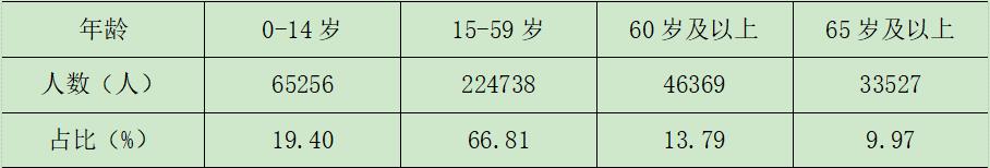 全區(qū)常住人口中,0-14歲[6]人口為65256人,占19.40%;15-59歲人口為224738人,占66.81%;60歲及以上人口為46369人,占13.79%,其中65歲及以上人口為33527人,占9.97%。與2010年第六次全國人口普查相比,0-14歲人口的比重上升2.16個(gè)百分點(diǎn),15-59歲人口的比重下降3.13個(gè)百分點(diǎn),60歲及以上人口的比重上升1.07個(gè)百分點(diǎn),65歲及以上人口的比重上升1.65個(gè)百分點(diǎn)。烏當(dāng)區(qū)第七次全國人口普查公報(bào)