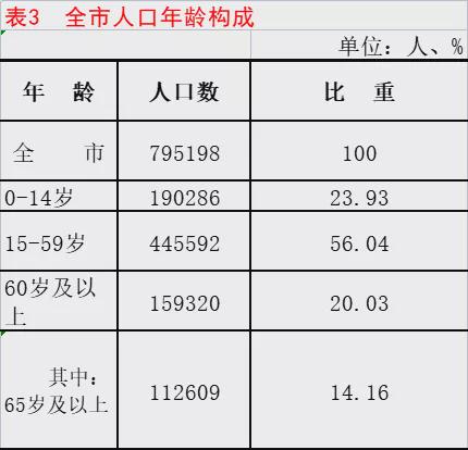 一、常住人口全市常住人口[2] 795198人,與2010年第六次全國人口普查810306人相比,減少15108人,下降1.86 %,年平均增長率為- 0.19 %。