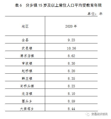 9個(gè)鄉(xiāng)鎮(zhèn)中,平均受教育年限在9年以上的有1個(gè),在8年至9年之間的有8個(gè)。武邑縣第七次全國(guó)人口普查公報(bào)