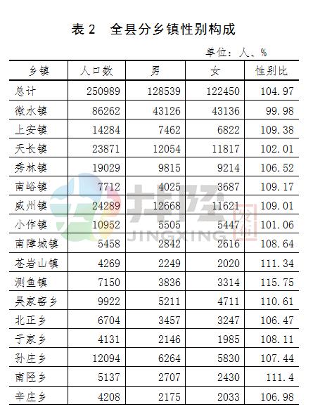 全縣常住人口中,男性人口為128539人,占51.21%;女性人口為122450人,占48.79%。總?cè)丝谛詣e比(以女性為100,男性對女性的比例)為104.97,比2010年第六次全國人口普查上升0.15個百分點。