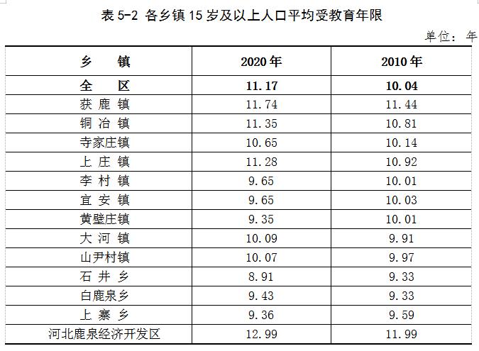 與2010年第六次全國(guó)人口普查相比,全區(qū)常住人口中,15歲及以上人口的平均受教育年限由10.04年提高至11.17年。石家莊市鹿泉區(qū)第七次全國(guó)人口普查公報(bào)