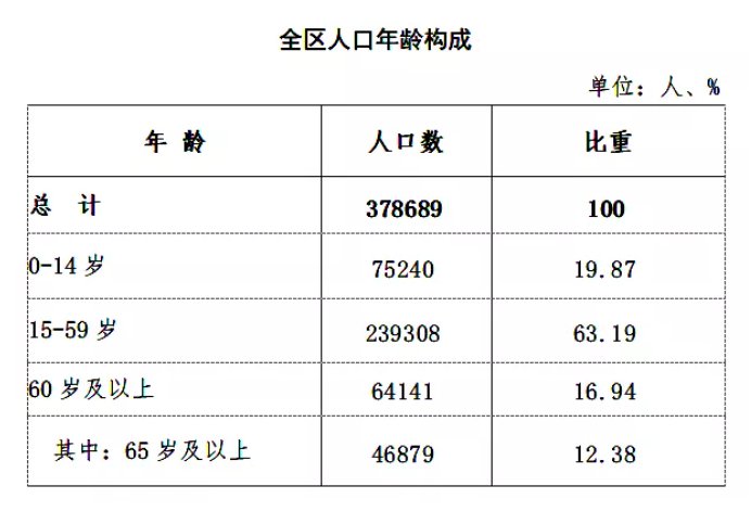 全區(qū)常住人口中,0-14歲[3]人口為75240人,占19.87%;15-59歲人口為239308人,占63.19%;60歲及以上人口為64141人,占16.94%,其中65歲及以上人口為46879人,占12.38%。與2010年第六次全國人口普查相比,0-14歲人口的比重上升4.88個百分點,15-59歲人口的比重下降9.58個百分點,60歲及以上人口的比重上升4.7個百分點,65歲及以上人口的比重上升4.74個百分點。
