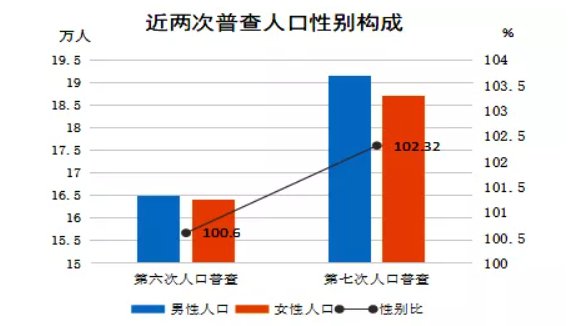 全區(qū)常住人口中,男性人口為191513人,占50.57%;女性人口為187176人,占49.43%???cè)丝谛詣e比(以女性為100,男性對女性的比例)為102.32,比2010年第六次全國人口普查上升1.72。