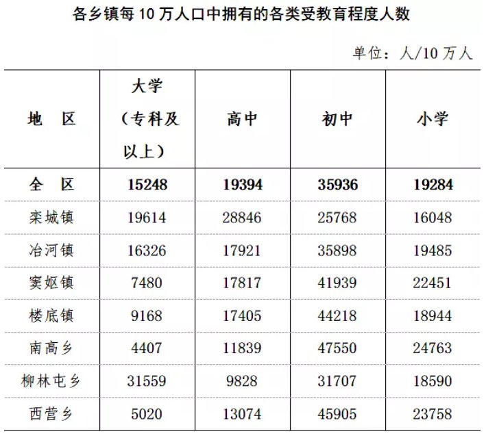 全區(qū)常住人口中,擁有大學(指大專及以上)文化程度的人口為57742人;擁有高中文化程度的人口為73444人;擁有初中文化程度的人口為136087人;擁有小學文化程度的人口為 73028人(以上各種受教育程度的人包括各類學校的畢業(yè)生、肄業(yè)生和在校生)。與2010年第六次全國人口普查相比,每10萬人中擁有大學文化程度的由5725人增加為15248人;擁有高中文化程度的由19239人增加為19394人;擁有初中文化程度的由45704人減少為35936人;擁有小學文化程度的由20201人減少為19284人。
