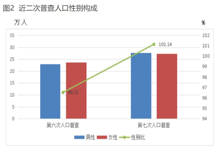 全縣常住人口中,男性人口為276213人,占50.28%;女性人口為273108人,占49.72%??側丝谛詣e比(以女性為100,男性對女性的比例)為101.14,比2010年第六次全國人口普查上升4.62個百分點。