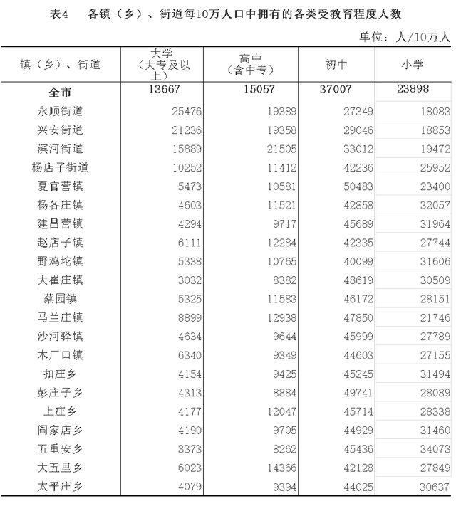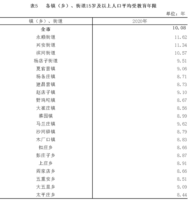 與2010年第六次全國人口普查相比,全市常住人口中,15歲及以上人口的平均受教育年限[5]由9.29年提高至10.08年。