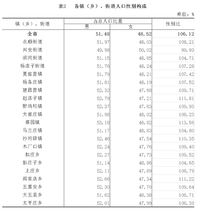 全市常住人口中,男性人口為399910人,占51.48%;女性人口為376842人,占48.52%???cè)丝谛詣e比(以女性為100,男性對女性的比例)為106.12,比2010年第六次全國人口普查上升0.38。