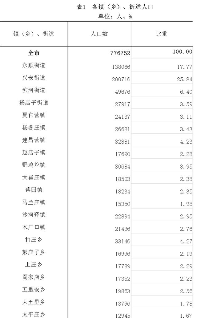 全市常住人口[2]為 776752人,與2010年第六次全國人口普查的728160人相比,增加48592人,增長6.67%,年平均增長率為0.65%。