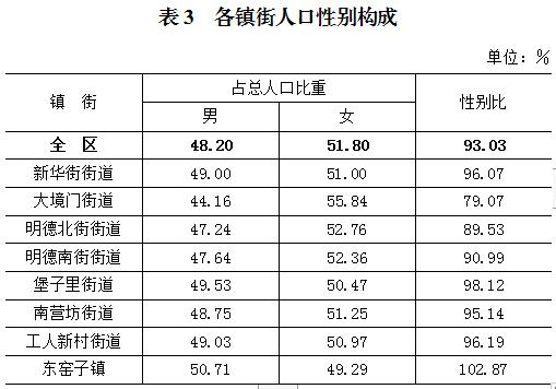 全區(qū)常住人口中,男性人口為134480人,占48.20%;女性人口為144553人,占51.80%???cè)丝谛詣e比(以女性為100,男性對女性的比例)為93.03,比2010年第六次全國人口普查下降3.49個百分點(diǎn) 。