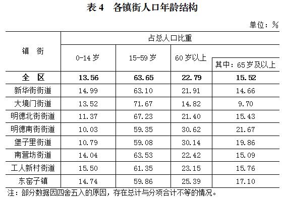 全區(qū)常住人口中,0-14歲[4]人口為37827人,占13.56%;15-59歲人口為177611人,占63.65%;60歲及以上人口為63595人,占22.79%,其中65歲及以上人口為43317人,占15.52%。與2010年第六次全國人口普查相比,0-14歲人口的比重上升1.96個百分點(diǎn),15-59歲人口的比重下降10個百分點(diǎn),60歲及以上人口的比重上升8.04個百分點(diǎn),65歲及以上人口的比重上升5.48個百分點(diǎn)。