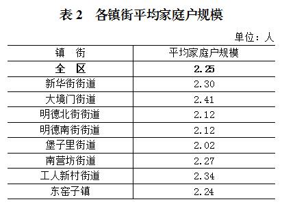 全區(qū)共有家庭戶[3] 111646戶、集體戶5807戶;家庭戶人口為251346人、集體戶人口為27687人。平均每個家庭戶的人口為2.25人,比2010年第六次全國人口普查的2.59人減少0.34人。