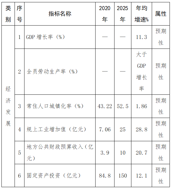 聚焦經(jīng)濟(jì)社會(huì)高質(zhì)量發(fā)展,到“十四五”末,全縣地區(qū)生產(chǎn)總值達(dá)到150億元,地方公共財(cái)政預(yù)算收入達(dá)到10億元,固定資產(chǎn)投資達(dá)到150億元,規(guī)模以上工業(yè)增加值達(dá)到25億元,社會(huì)消費(fèi)品零售總額達(dá)到90億元,城鄉(xiāng)居民人均可支配收入分別達(dá)到4.69萬(wàn)元、1.92萬(wàn)元。具體指標(biāo)如下: