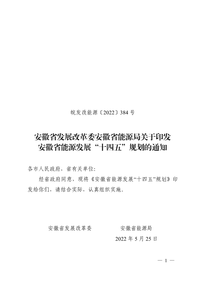 經(jīng)省政府同意,現(xiàn)將《安徽省能源發(fā)展“十四五”規(guī)劃》印發(fā)給你們,請結合實際,認真組織實施。