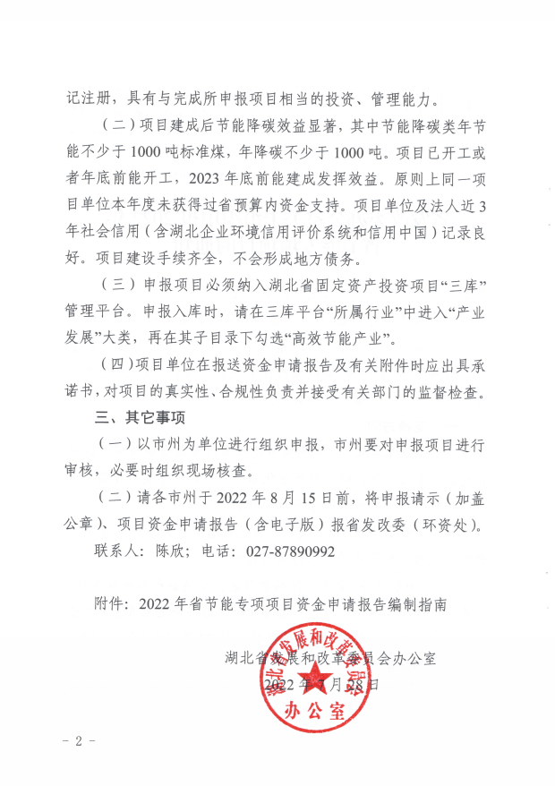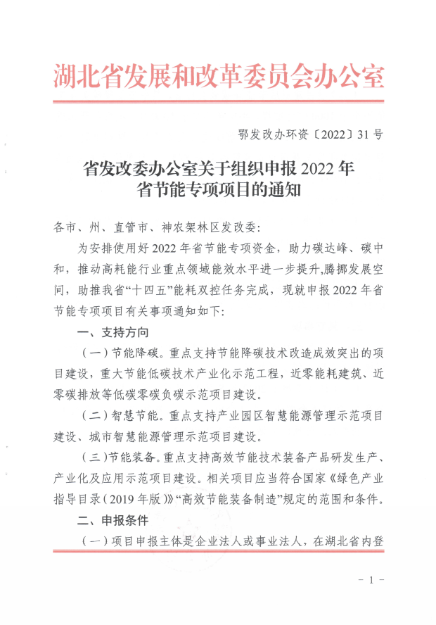 湖北省發(fā)改委發(fā)布關(guān)于組織申報2022年省節(jié)能專項項目的通知,重點支持節(jié)能降碳技術(shù)改造成效突出項目建設(shè)、重大節(jié)能低碳技術(shù)產(chǎn)業(yè)化示范工程、高效節(jié)能技術(shù)裝備產(chǎn)品研發(fā)生產(chǎn)、產(chǎn)業(yè)化及應(yīng)用示范項目建設(shè)等。詳情如下: