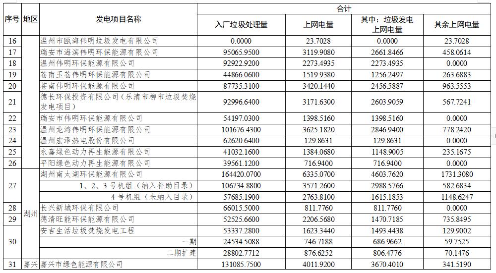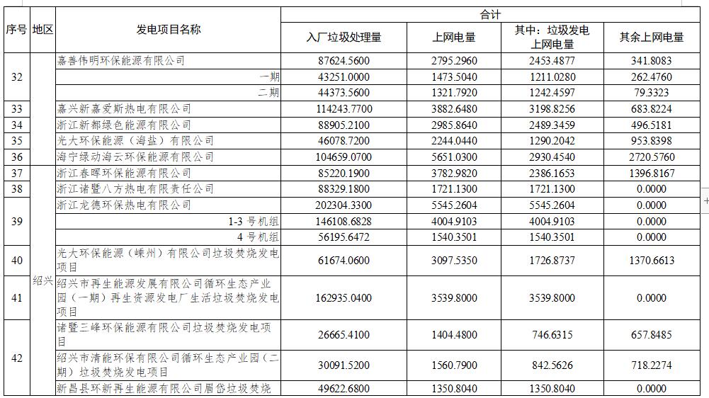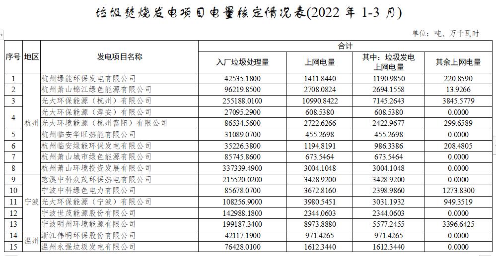 浙江垃圾焚燒發(fā)電項(xiàng)目電量核定情況表(2022年1-3月)