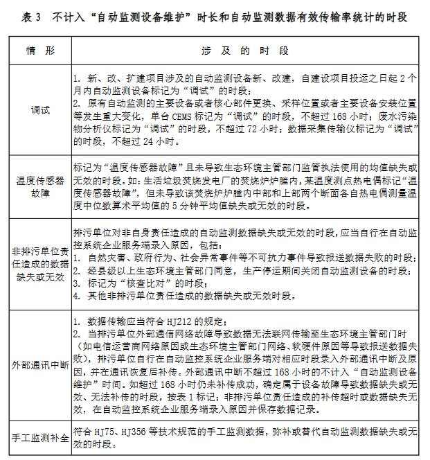 表 3 所列情形及相應(yīng)時(shí)段不計(jì)入“自動(dòng)監(jiān)測(cè)設(shè)備維護(hù)”時(shí)長(zhǎng),不參與自動(dòng)監(jiān)測(cè)數(shù)據(jù)有效傳輸率統(tǒng)計(jì)。