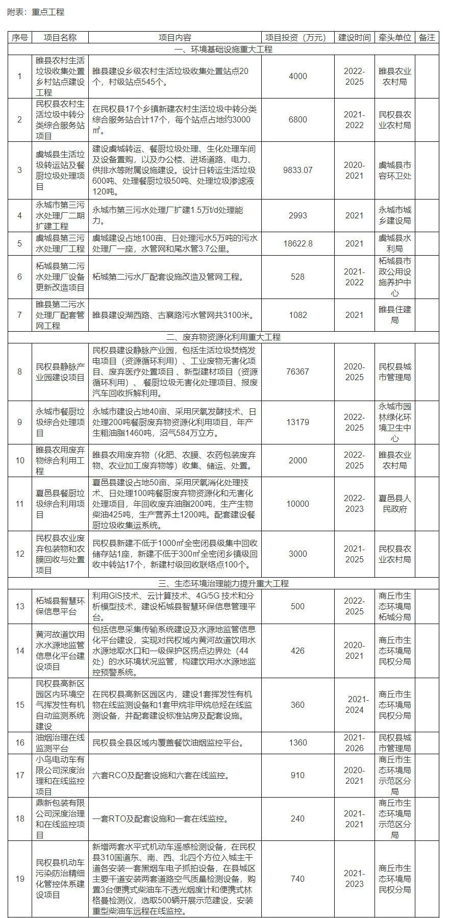 (四)重點工程:圍繞環(huán)境基礎(chǔ)設(shè)施、固廢綜合利用、治理能力現(xiàn)代化、生態(tài)環(huán)境質(zhì)量調(diào)查評估、污染治理、生態(tài)建設(shè)謀劃了6個方面的項目。