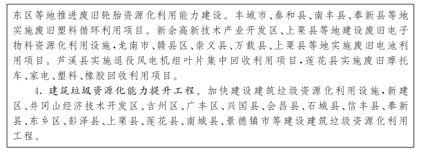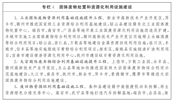 (七)持續(xù)推進固體廢物處置設施建設。聚焦煤矸石、粉煤灰、尾礦(共伴生礦)、冶煉渣、工業(yè)副石膏、建筑垃圾、農(nóng)作物秸稈、鋰渣等大宗固體廢物,實施一批規(guī)?;?、高值化、高質(zhì)化利用項目。推進國家級大宗固體廢棄物綜合利用示范基地和國家級工業(yè)資源綜合利用基地建設,帶動固體廢物處置及綜合利用設施建設。完善建筑垃圾回收利用政策,加強建筑垃圾精細化分類及資源化利用,鼓勵建設國家級建筑垃圾資源化利用示范城市,提高建筑垃圾資源化再生利用產(chǎn)品質(zhì)量和市場使用規(guī)模。支持南昌、吉安等地建設國家級廢舊物資循環(huán)利用體系示范城市。加快完善廢舊物資回收網(wǎng)絡體系,建設一批規(guī)?;⒕W(wǎng)絡化、智能化的廢舊物資回收基礎設施。探索鋰渣處理處置系統(tǒng)方案,統(tǒng)籌做好鋰渣消納及資源化利用設施建設。新建和改造一批再生資源加工利用項目,推進報廢機動車等廢棄物分類利用和集中處置,引導再生資源加工利用項目集聚發(fā)展。(省發(fā)展改革委、省工業(yè)和信息化廳、省住房城鄉(xiāng)建設廳、省商務廳、省自然資源廳、省生態(tài)環(huán)境廳按職責分工負責)