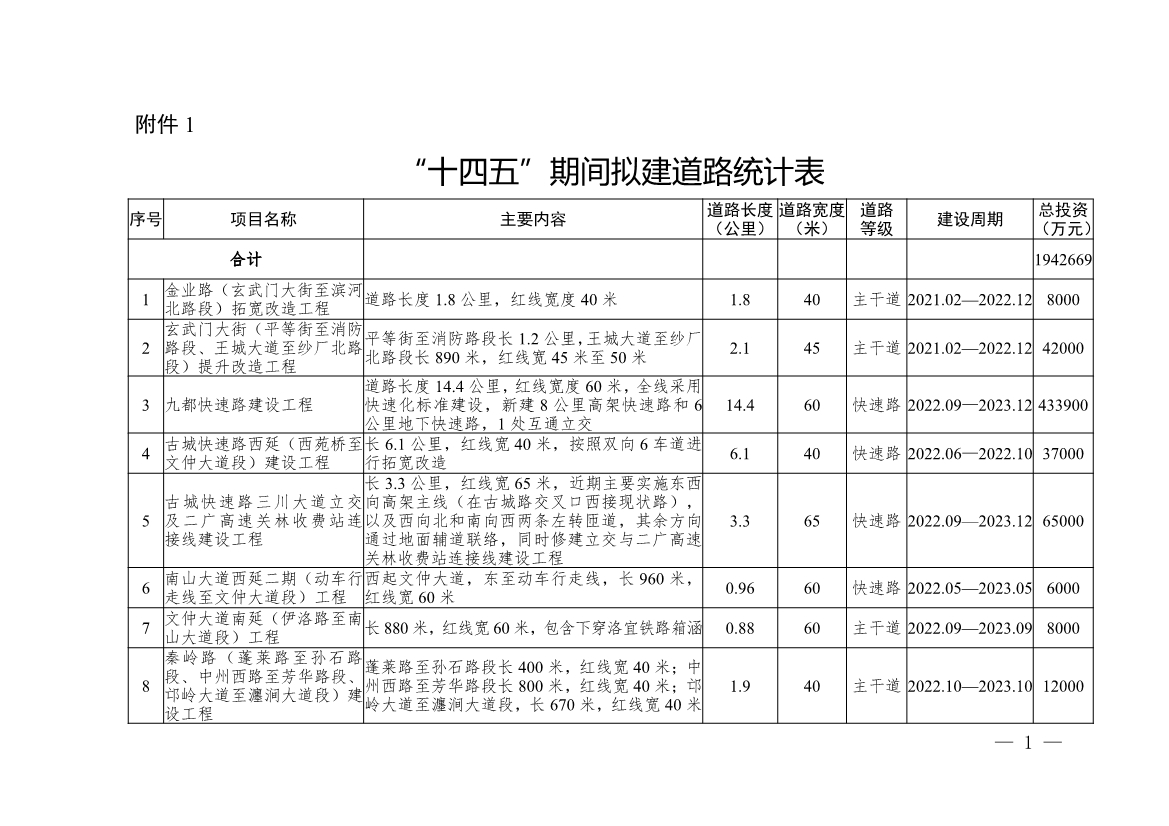 附件:1.“十四五”期間擬建道路統(tǒng)計(jì)表