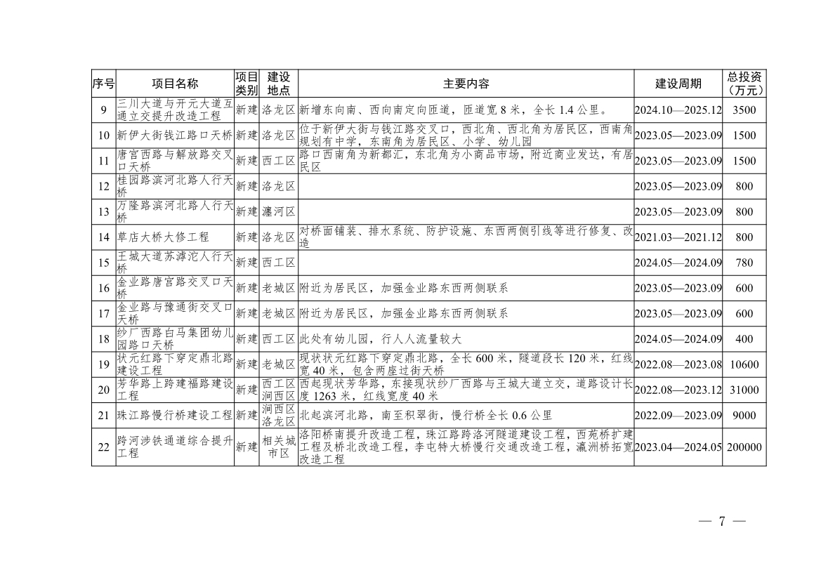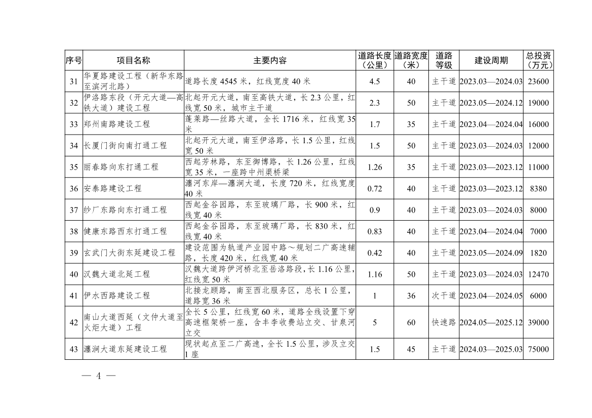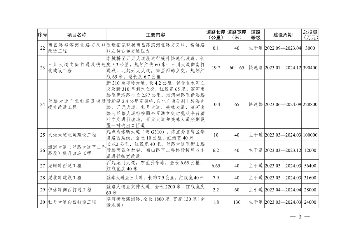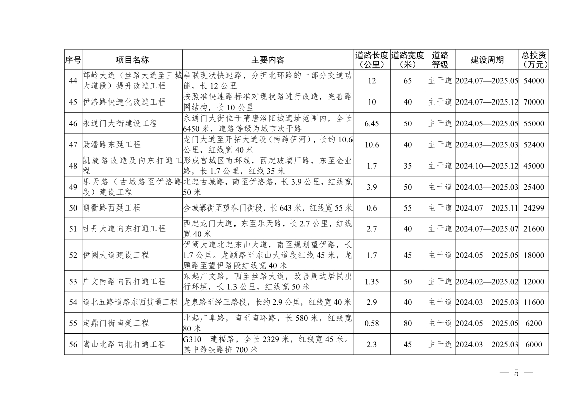 一是突出“交通暢達(dá)”的要求,建設(shè)全國暢通宜居城市。暢通城市“血脈”循環(huán),打通“微循環(huán)”。加快完善城市快速路網(wǎng),開工建設(shè)絲路大道快速化、濱河南路提升改造等項(xiàng)目,構(gòu)建“三縱三橫”的城市快速路網(wǎng)體系。將放射線作為建設(shè)重點(diǎn),盡快建成古城快速路西延、南山大道西延、九都路快速化等工程,增加網(wǎng)絡(luò)密度,打造快速便捷、互聯(lián)互通的快速路網(wǎng)絡(luò)。提升環(huán)線通達(dá)能力,優(yōu)化立交節(jié)點(diǎn),加快推進(jìn)西韓立交、古城快速路三川大道立交等立交工程建設(shè);加密過河、過鐵通道,建設(shè)火炬大橋、新伊大街、八里堂、唐寺門等12個(gè)通道項(xiàng)目。構(gòu)建“六縱六橫”城市主干路網(wǎng)體系。“六縱”:火炬大道、龍門大道—洛吉快速路、新伊大街、光武大道、掘丁路、相國大道;“六橫”:新310國道、瀍澗大道、玄武門大街、中州路、開元大道、伊洛路。謀劃實(shí)施偃師區(qū)杜甫大道快速化、孟津區(qū)瀍源大道北延等15項(xiàng)區(qū)劃調(diào)整區(qū)域重點(diǎn)工程,建設(shè)秦嶺路北延、文仲大道南延等83項(xiàng)次干路。2021年,改造提升解放路、開元大道等13條道路;2022年,改造提升瀍澗大道、光華路等既有道路;2023年,在各城市區(qū)規(guī)劃修建5至8條規(guī)劃城市道路。進(jìn)一步改善城區(qū)交通結(jié)構(gòu),形成快速路、主干路、次干路、支路級(jí)配合理、功能完善的四級(jí)路網(wǎng)結(jié)構(gòu)。暢通城市道路“微循環(huán)”。聚焦現(xiàn)狀交通擁堵點(diǎn)及出行難區(qū)域,結(jié)合棚戶區(qū)改造、“四河五渠”治理等工作,集中謀劃實(shí)施一批城市支路建設(shè)工程。2021年,打通宜人路、廣利街等12條“斷頭路”,2022年,謀劃實(shí)施秦嶺路、祥云路等14條“斷頭路”打通工程,2023年后,打通麗春路、夾馬營路等城市“斷頭路”,提升改造北盟路、瀍澗大道等“卡脖子路”,加快“斷頭路”打通速度,疏通城市道路“腸梗阻”,構(gòu)建交通“微循環(huán)”。形成城市區(qū)30分鐘通勤圈,確保城市快速路與周邊高速公路出入口、國省干線快速高效銜接。二是突出專屬路權(quán),構(gòu)建安全便捷的慢行交通體系。以改善居民出行環(huán)境、保障出行安全、倡導(dǎo)綠色出行為目標(biāo),借鑒歐洲和我國沿海城市的先進(jìn)經(jīng)驗(yàn),按照國際標(biāo)準(zhǔn)建設(shè)城市樂道,同步完善非機(jī)動(dòng)車道和人行立體過街設(shè)施,加強(qiáng)自行車停車設(shè)施、照明設(shè)施、道路林蔭綠化等建設(shè),構(gòu)建“安全、便捷、和諧、綠色”的慢行交通體系,提升市民非機(jī)動(dòng)出行的幸福感和獲得感。在城市樂道建設(shè)方面,繼續(xù)堅(jiān)持“串珠成鏈、縱橫綿延”的理念,強(qiáng)化游園“樂道”、濱河“樂道”、文化“樂道”、郊野“樂道”、山林“樂道”有機(jī)串聯(lián),切實(shí)把洛陽老街老巷老建筑、好山好水好風(fēng)光、游園小區(qū)大公園串聯(lián)起來,著力形成互聯(lián)互通的城市“樂道”閉合圈,打造生態(tài)優(yōu)美的幸?!皹返馈薄?021年建成隋唐遺址南城墻樂道等300公里樂道;2022年至2023年,貫通縣區(qū)樂道連接線,形成互聯(lián)互通的城市“樂道”閉合圈。三是突出韌性高效,加快推進(jìn)海綿城市和綜合管廊建設(shè)。隨著道路改造、背街小巷整治等工程,實(shí)施32項(xiàng)海綿城市工程,增加城市海綿化面積64954平方米。到2025年,城市、縣城建成區(qū)50%、20%以上面積達(dá)到海綿城市的要求和標(biāo)準(zhǔn),實(shí)現(xiàn)80%以上降雨就地消納和利用。持續(xù)推進(jìn)地下空間“多規(guī)合一”,城市老城區(qū)結(jié)合架空管線入地及道路改建擴(kuò)建,重點(diǎn)推進(jìn)纜線管廊建設(shè);城市新區(qū)、各類園區(qū)、成片開發(fā)區(qū)域根據(jù)發(fā)展定位和功能需求,科學(xué)確定管廊斷面類型、建設(shè)規(guī)模,因地制宜,統(tǒng)籌推進(jìn)地下綜合管廊建設(shè)。四是突出綜合施策,深化城市生態(tài)水系治理。深化“四河同治,五渠聯(lián)動(dòng)”綜合治理,將四河五渠綜合治理向源頭、支流、末梢延伸,向全市域河、渠、湖、塘拓展,全面實(shí)現(xiàn)“水清、岸綠、路暢、惠民”目標(biāo)。建立健全常態(tài)化監(jiān)測、排查、整改機(jī)制,抓好黑臭水體整治;加強(qiáng)沿線老舊小區(qū)、街道雨污管網(wǎng)建設(shè),抓好雨污分流改造;持續(xù)完善沿河路網(wǎng),加快構(gòu)建城市濱河主干道、親水慢行道、游園小步道三級(jí)濱河路網(wǎng)體系;持續(xù)攻堅(jiān)沿河棚改,引導(dǎo)群眾有序搬遷,到2025年,著力把“四河五渠”綜合治理打造成黃河流域生態(tài)保護(hù)的示范標(biāo)桿。持續(xù)推進(jìn)城市區(qū)污水處理。2022年底完成洛陽市澗西污水處理廠、瀍東污水處理廠、新區(qū)污水處理廠、伊濱污水處理廠提標(biāo)工程建設(shè);2022年底前建成洛陽市紅山鄉(xiāng)污水處理廠3萬噸,2025年底完成瀍東污水處理廠二期第二階段5萬噸擴(kuò)建工程、新區(qū)污水處理廠三期一階段擴(kuò)建工程、伊濱污水處理廠一期二階段5萬噸擴(kuò)建工程。到2025年,實(shí)現(xiàn)城市污水處理率達(dá)到100%,