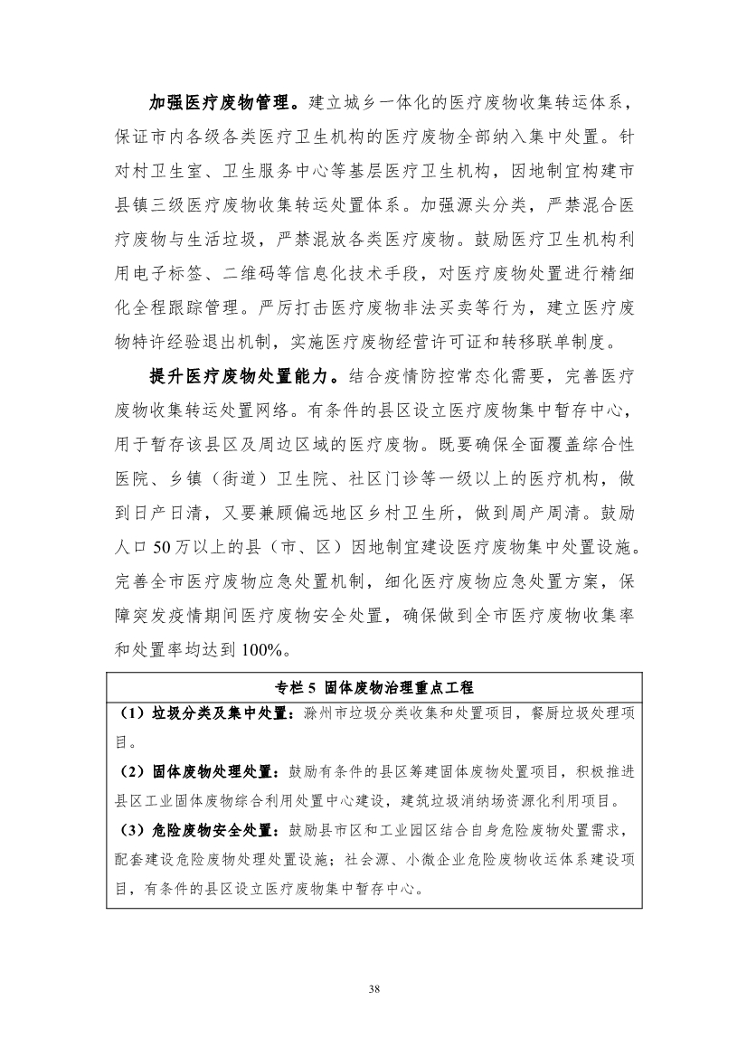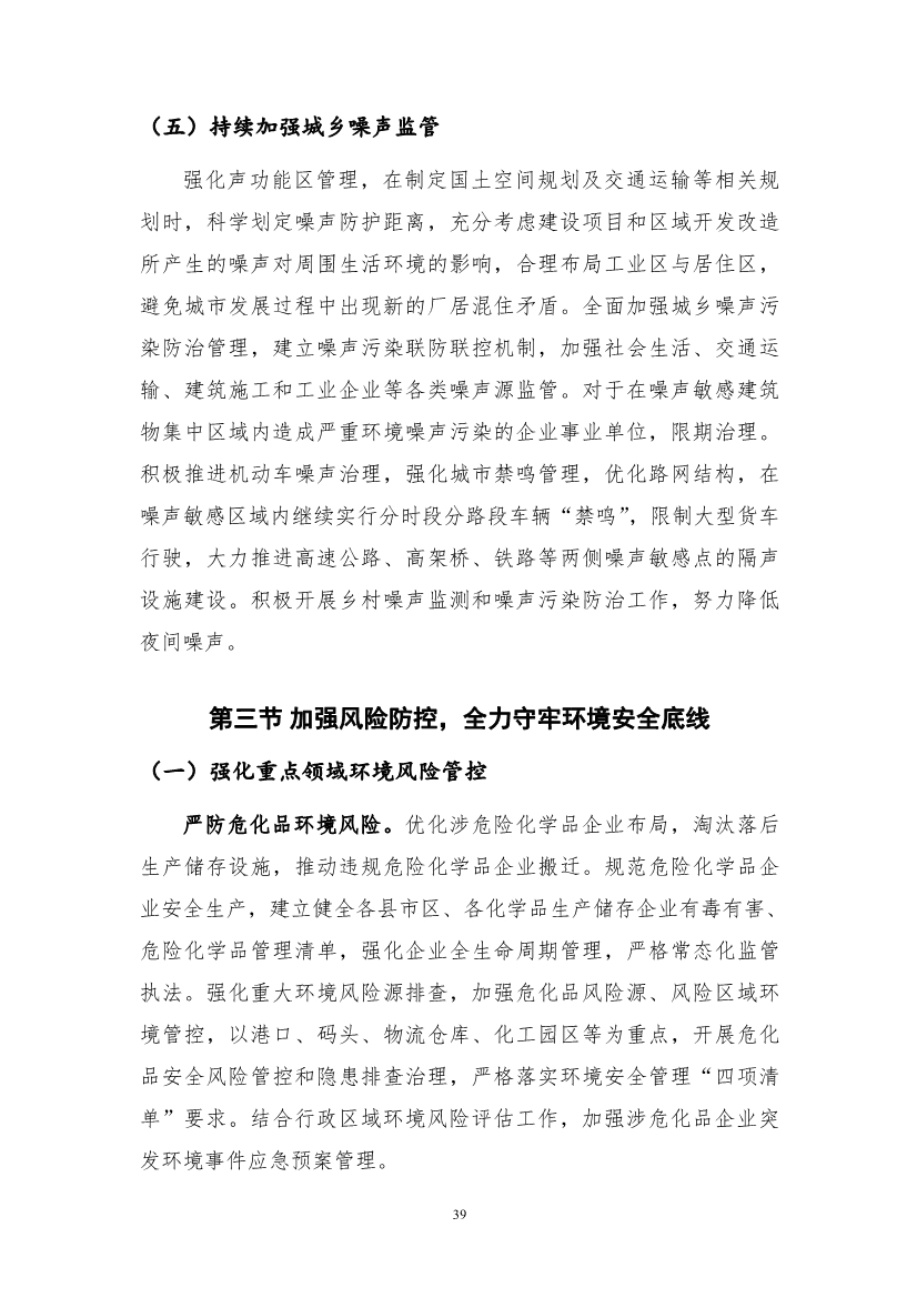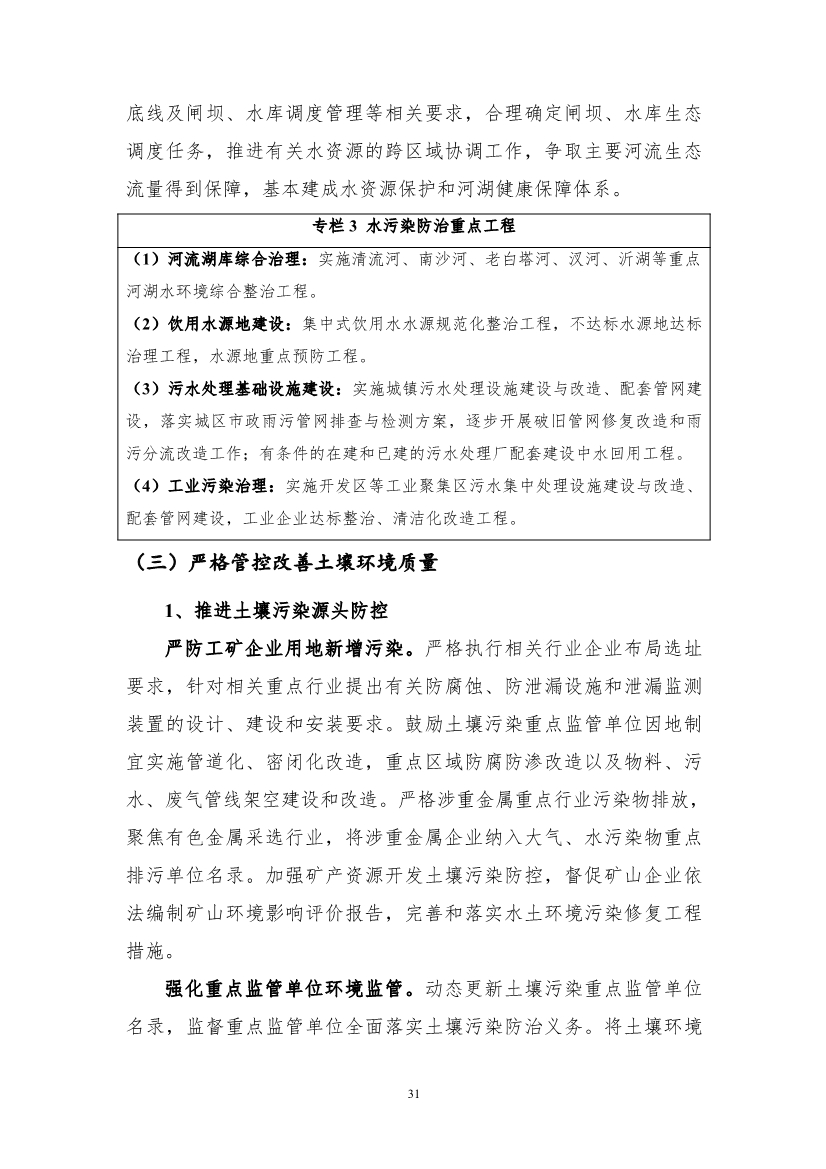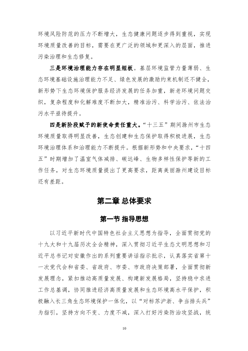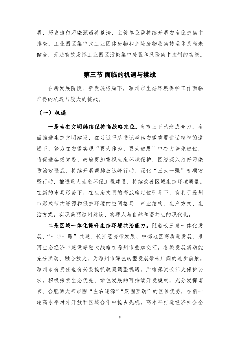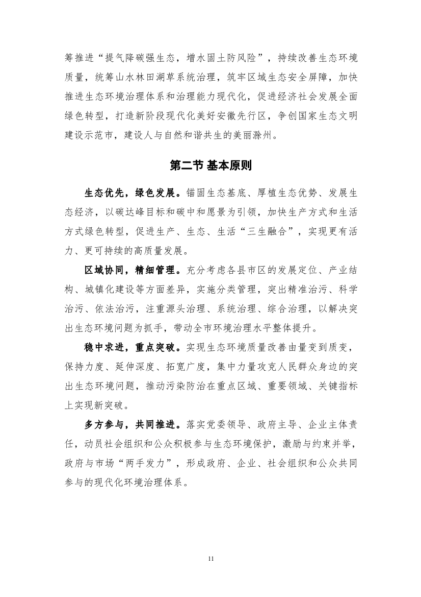 第三部分是主要任務(wù)和舉措,緊密結(jié)合滁州市國(guó)民經(jīng)濟(jì)和社會(huì)發(fā)展第十四個(gè)五年規(guī)劃和二〇三五年遠(yuǎn)景目標(biāo)綱要,《規(guī)劃》明確了“十四五”時(shí)期生態(tài)環(huán)境保護(hù)七項(xiàng)任務(wù)。一是強(qiáng)化源頭治理,助力全面轉(zhuǎn)型綠色發(fā)展;二是深化污染攻堅(jiān),持續(xù)改善生態(tài)環(huán)境質(zhì)量;三是加強(qiáng)風(fēng)險(xiǎn)防控,全力守牢環(huán)境安全底線;四是開(kāi)展保護(hù)修復(fù),筑牢區(qū)域生態(tài)安全屏障;五是改善農(nóng)村環(huán)境,打造鄉(xiāng)村振興示范標(biāo)桿;六是落實(shí)共保聯(lián)治,積極融入長(zhǎng)三角一體化;七是堅(jiān)持改革創(chuàng)新,完善治理體系治理能力。圍繞規(guī)劃目標(biāo)和主要任務(wù),推進(jìn)實(shí)施綠色低碳轉(zhuǎn)型、大氣污染防治、水污染防治、土壤和地下水污染防治、固廢治理、生態(tài)保護(hù)與修復(fù)、農(nóng)村環(huán)境綜合整治、生態(tài)環(huán)境治理能力建設(shè)等重大工程。