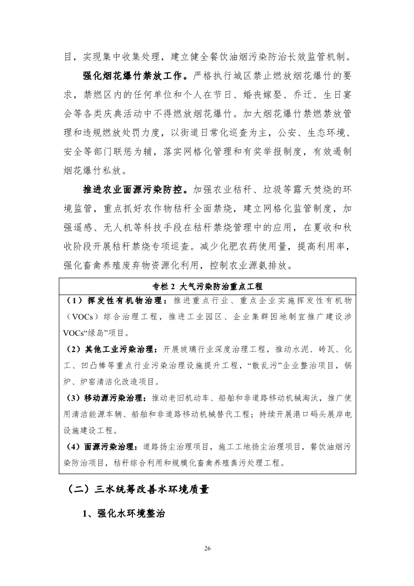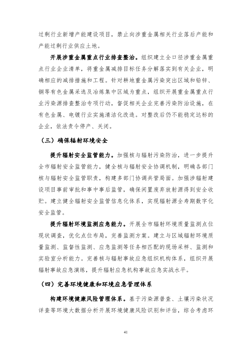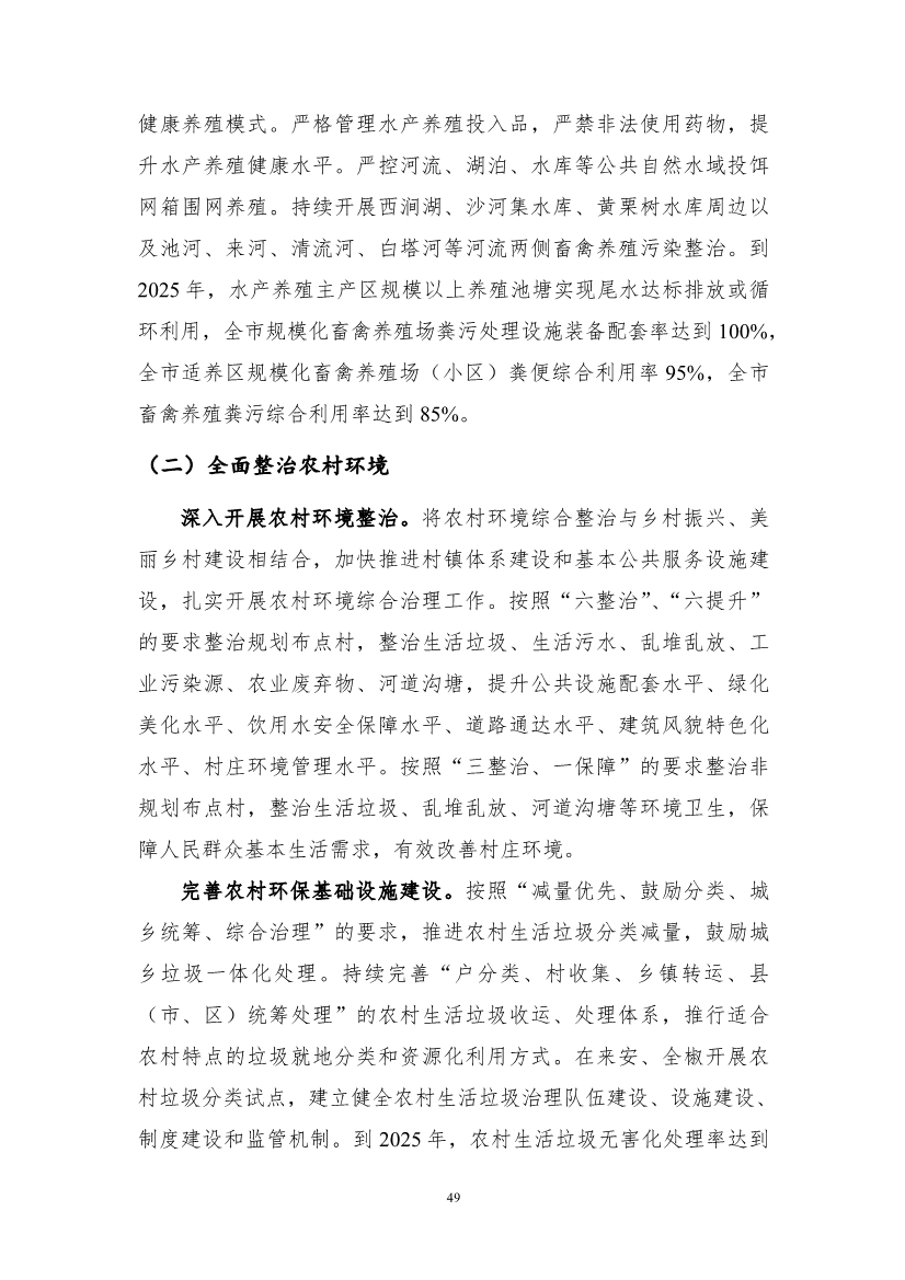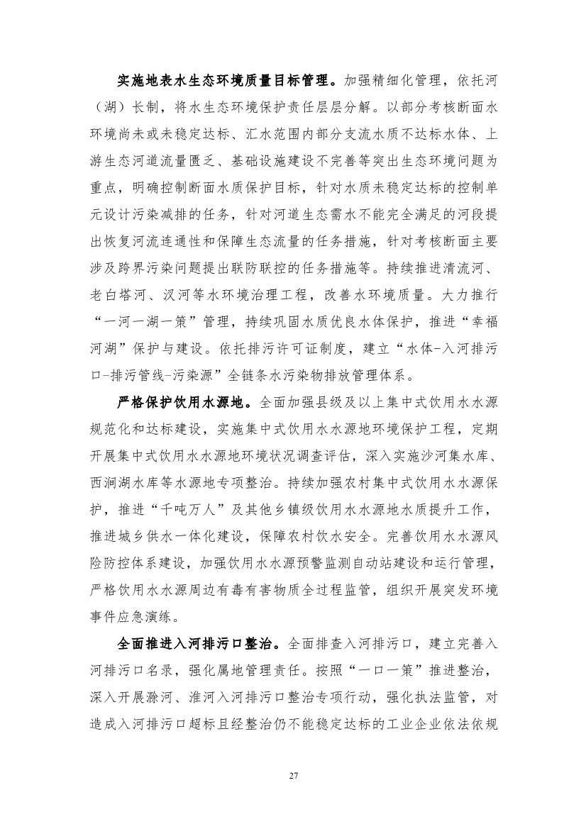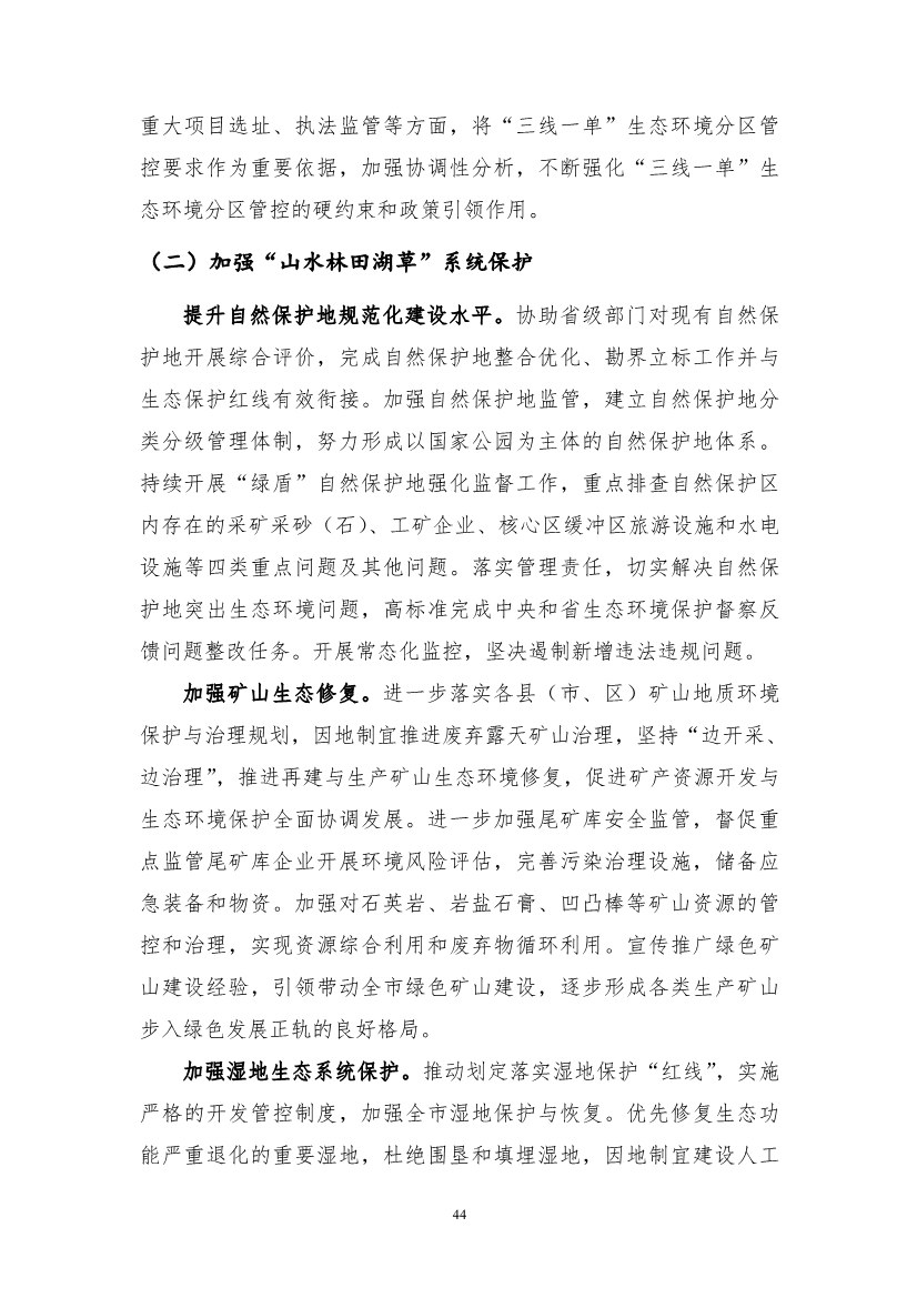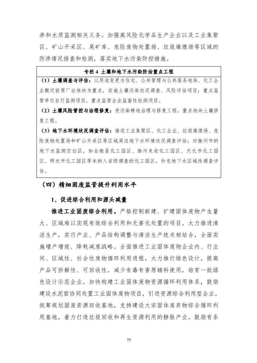 第三部分是主要任務(wù)和舉措,緊密結(jié)合滁州市國(guó)民經(jīng)濟(jì)和社會(huì)發(fā)展第十四個(gè)五年規(guī)劃和二〇三五年遠(yuǎn)景目標(biāo)綱要,《規(guī)劃》明確了“十四五”時(shí)期生態(tài)環(huán)境保護(hù)七項(xiàng)任務(wù)。一是強(qiáng)化源頭治理,助力全面轉(zhuǎn)型綠色發(fā)展;二是深化污染攻堅(jiān),持續(xù)改善生態(tài)環(huán)境質(zhì)量;三是加強(qiáng)風(fēng)險(xiǎn)防控,全力守牢環(huán)境安全底線;四是開(kāi)展保護(hù)修復(fù),筑牢區(qū)域生態(tài)安全屏障;五是改善農(nóng)村環(huán)境,打造鄉(xiāng)村振興示范標(biāo)桿;六是落實(shí)共保聯(lián)治,積極融入長(zhǎng)三角一體化;七是堅(jiān)持改革創(chuàng)新,完善治理體系治理能力。圍繞規(guī)劃目標(biāo)和主要任務(wù),推進(jìn)實(shí)施綠色低碳轉(zhuǎn)型、大氣污染防治、水污染防治、土壤和地下水污染防治、固廢治理、生態(tài)保護(hù)與修復(fù)、農(nóng)村環(huán)境綜合整治、生態(tài)環(huán)境治理能力建設(shè)等重大工程。