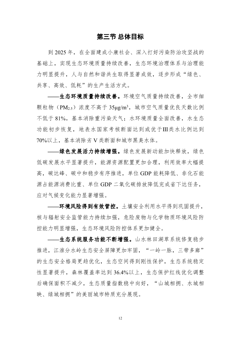 第二部分是總體要求,主要包括指導(dǎo)思想、基本原則、總體目標(biāo)和指標(biāo)體系。根據(jù)國(guó)家、安徽省“十四五”生態(tài)環(huán)境保護(hù)規(guī)劃指標(biāo)體系,按照導(dǎo)向明確、可控可達(dá)、便于考核的原則,《規(guī)劃》確定了包括環(huán)境治理、應(yīng)對(duì)氣候變化、環(huán)境風(fēng)險(xiǎn)防控、生態(tài)保護(hù)、生態(tài)示范建設(shè)五大類18項(xiàng)主要考核指標(biāo)。
