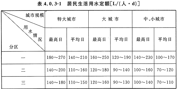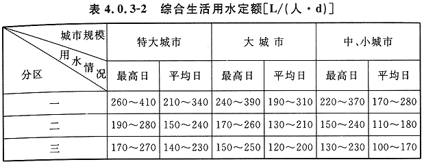 4.0.3 居民生活用水定額和綜合生活用水定額應(yīng)根據(jù)當(dāng)?shù)貒窠?jīng)濟和社會發(fā)展、水資源充沛程度、用水習(xí)慣,在現(xiàn)有用水定額基礎(chǔ)上,結(jié)合城市總體規(guī)劃和給水專業(yè)規(guī)劃,本著節(jié)約用水的原則,綜合分析確定。當(dāng)缺乏實際用水資料情況下,可按表 4.0.3-1 和表 4.0.3-2 選用。