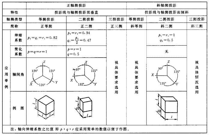 軸側(cè)投影是將物體連同其參考直角坐標(biāo)系,沿不平行于任一坐標(biāo)面的方向,用平行投影法將其投射在單一投影面上所得的具有立體感的圖形。常用的軸側(cè)投影見表12。