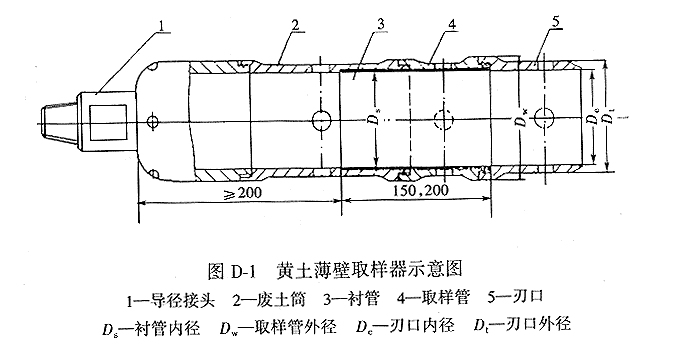 D.0.3 宜使用帶內(nèi)襯的黃土薄壁取樣器,對結(jié)構(gòu)較松散的黃土,不宜使用無內(nèi)襯的黃土薄壁取樣器,其內(nèi)徑不宜小于120mm,刃口壁的厚度不宜大于3mm,刃口角度為10°~12°,控制面積比為12%~15%,其尺寸規(guī)格可按表D-1采用,取樣器的構(gòu)造見附圖D。