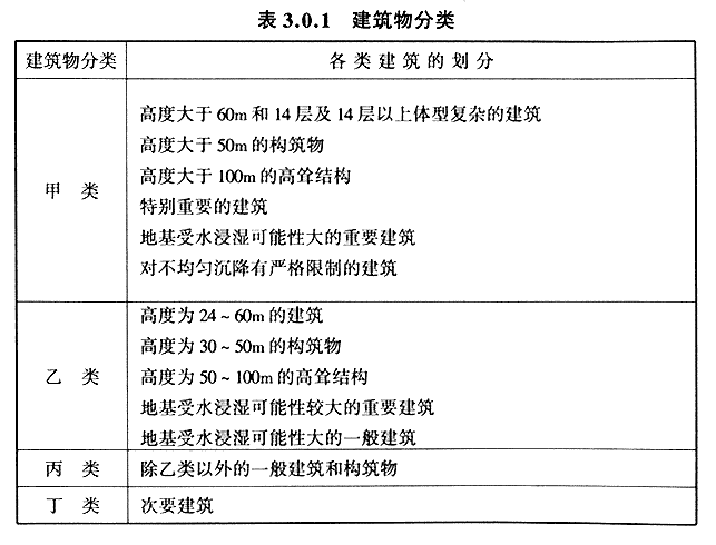 3.0.1 擬建在濕陷性黃土場地上的建筑物,應(yīng)根據(jù)其重要性、地基受水浸濕可能性的大小和在使用期間對不均勻沉降限制的嚴(yán)格程度,分為甲、乙、丙、丁四類,并應(yīng)符合表3.0.1的規(guī)定。
