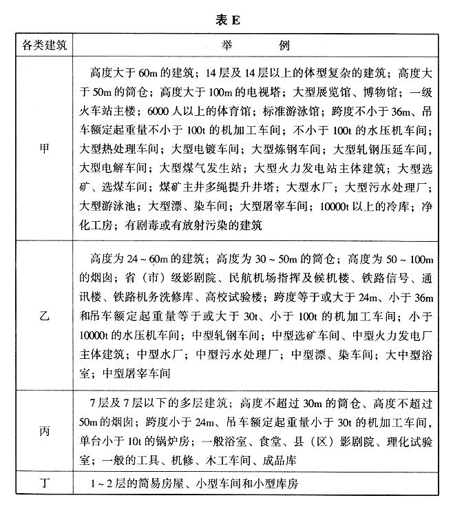 當(dāng)建筑物各單元的重要性不同時,可根據(jù)各單元的重要性劃分為不同類別。甲、乙、丙、丁四類建筑的劃分,可結(jié)合本規(guī)范附錄E確定。