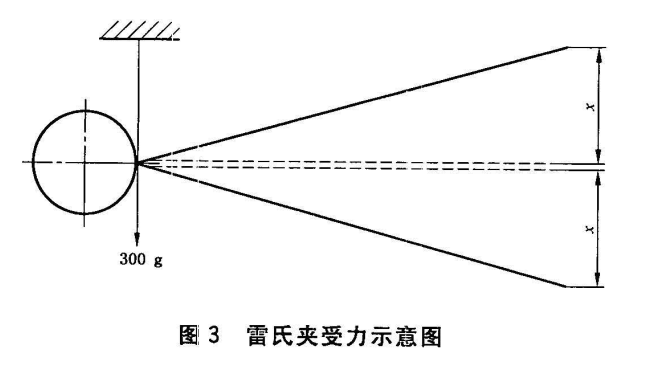 由銅質材料制成,其結構如圖2。當一根指針的根部先懸掛在一根金屬絲或尼龍絲上,另一根指針的根部再掛上300 g質量的砝碼時,兩根指針針尖的距離增加應在17.5 mm±2.5 mm范圍內,即2x=17.5 mm±2.5 mm(見圖3),當去掉砝碼后針尖的距離能恢復至掛砝碼前的狀態(tài)。