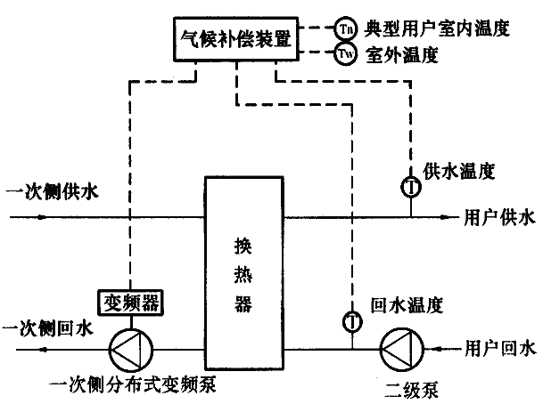 圖C.0.3-3 水-水換熱系統(tǒng)采用一次側(cè)分布式變頻控制氣候補(bǔ)償系統(tǒng)流程示意圖