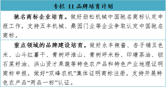 48.發(fā)展精細(xì)農(nóng)業(yè)。對(duì)接全省農(nóng)業(yè)農(nóng)村“百千萬”工程,打造“六大強(qiáng)農(nóng)”行動(dòng)升級(jí)版,堅(jiān)持把精細(xì)農(nóng)業(yè)理念貫穿農(nóng)業(yè)生產(chǎn)經(jīng)營全過程,推動(dòng)品種培優(yōu)、品質(zhì)提升、品牌打造和標(biāo)準(zhǔn)化生產(chǎn),提高農(nóng)業(yè)質(zhì)量效益和競(jìng)爭(zhēng)力。實(shí)施產(chǎn)業(yè)興村強(qiáng)縣行動(dòng),培育農(nóng)業(yè)產(chǎn)業(yè)強(qiáng)鎮(zhèn),打造“一縣一特、一特一片”的發(fā)展格局。深入推進(jìn)農(nóng)業(yè)供給側(cè)結(jié)構(gòu)性改革,積極發(fā)展優(yōu)質(zhì)稻、油料、茶葉、辣醬、楠竹、中藥材、紅心臍橙、花卉苗木、蛋白桑等優(yōu)勢(shì)特色產(chǎn)業(yè),大力發(fā)展農(nóng)產(chǎn)品精深加工,打造“永豐辣醬”“青樹坪淮山”“杏子鋪五色米”“九峰云霧茶”“山斗紅薯干”及油茶、楠竹等雙峰特色品牌,培育壯大具有雙峰“地理標(biāo)志”的農(nóng)產(chǎn)品。穩(wěn)步推進(jìn)生豬生產(chǎn),積極發(fā)展湘村黑豬、中里黑豬、瀟湘花豬、湘中黑牛、青殼蛋雞等特色品種養(yǎng)殖,著力培育具有雙峰特色的蛋白桑系列畜禽產(chǎn)品,推進(jìn)畜牧業(yè)轉(zhuǎn)型升級(jí),到2025年畜禽糞污資源化利用率達(dá)到95%以上。調(diào)整優(yōu)化水產(chǎn)養(yǎng)殖結(jié)構(gòu)布局,擴(kuò)大水產(chǎn)養(yǎng)殖規(guī)模,開展池塘標(biāo)準(zhǔn)化改造,轉(zhuǎn)變漁業(yè)發(fā)展方式。健全動(dòng)物防疫和農(nóng)作物病蟲害防治體系。完善農(nóng)產(chǎn)品質(zhì)量追溯體系,強(qiáng)化標(biāo)準(zhǔn)控制和質(zhì)量安全監(jiān)管。加快培育農(nóng)業(yè)產(chǎn)業(yè)化龍頭企業(yè),發(fā)展農(nóng)民合作社、家庭農(nóng)場(chǎng)等新型經(jīng)營主體,推動(dòng)農(nóng)村一二三產(chǎn)業(yè)融合發(fā)展,建設(shè)一批國家級(jí)、省級(jí)農(nóng)村產(chǎn)業(yè)融合示范?,努力打造精細(xì)農(nóng)業(yè)先行區(qū),建設(shè)成為湘中綠色優(yōu)質(zhì)農(nóng)產(chǎn)品供應(yīng)基地、湖南休閑農(nóng)業(yè)示范區(qū)。打造永豐辣醬特色小鎮(zhèn)。培育青樹坪鎮(zhèn)淮山特色小鎮(zhèn)。支持石牛鄉(xiāng)建設(shè)楠竹特色小鎮(zhèn)。支持洪山殿鎮(zhèn)建設(shè)花卉苗木特色小鎮(zhèn)。