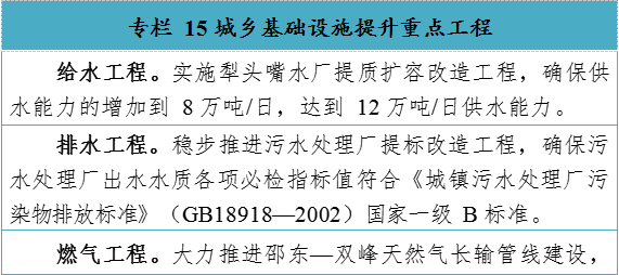 39.加快升級(jí)城鄉(xiāng)基礎(chǔ)設(shè)施。推動(dòng)城市供水、供電、供氣、通信、生活垃圾和污水處理等基礎(chǔ)設(shè)施建設(shè)向鄉(xiāng)鎮(zhèn)布局。大力改造提升城鎮(zhèn)老舊小區(qū),改善居民居住條件。加快推進(jìn)雙峰國家基本氣象觀測(cè)站搬遷工作。加快推進(jìn)城鄉(xiāng)供水一體化、城鄉(xiāng)公交一體化項(xiàng)目,實(shí)施衡邵干旱走廊綜合治理、新一輪農(nóng)村電網(wǎng)改造升級(jí)、“三網(wǎng)融合”的新一代廣播電視網(wǎng)絡(luò)、城區(qū)天然氣管道接駁工程、鄉(xiāng)鎮(zhèn)管道燃?xì)夤こ獭⒊青l(xiāng)垃圾分類收集一體化、農(nóng)村基礎(chǔ)設(shè)施扶貧項(xiàng)目(一期)等一批重大工程。推進(jìn)縣城提質(zhì)擴(kuò)容,有序推進(jìn)縣城地下空間利用,建好人防工程,加快城中河的提質(zhì)改造和污水處理,推進(jìn)橫塘水體、河?xùn)|片區(qū)綜合開發(fā)、南廣場(chǎng)綠地、體育公?建設(shè),提升城市品位,提升城鎮(zhèn)規(guī)劃建設(shè)水平,統(tǒng)籌各類小城鎮(zhèn)發(fā)展。優(yōu)化物流配送網(wǎng),加強(qiáng)冷鏈、配送投遞等物流基礎(chǔ)設(shè)施建設(shè),推進(jìn)物流儲(chǔ)備中心建設(shè),完善郵政普遍服務(wù)基礎(chǔ)設(shè)施。
